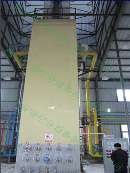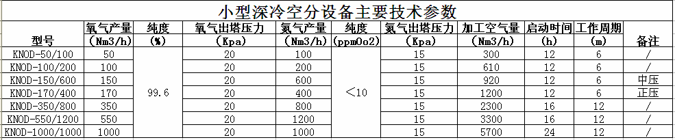 小型深冷空分设备采用低压流程,利用深度冷冻及精馏的方法从空气中提取纯氧和纯氮,即利用透平膨胀机冷冻循环原理使空气液化,根据液氧和液氮的沸点不同,在分馏塔内进行二次精馏,从而获得99.6%纯度的氧气及99.99%以上纯度的氮气。根据需要,改变操作亦可制取部分液氧、液氮和医用氧。