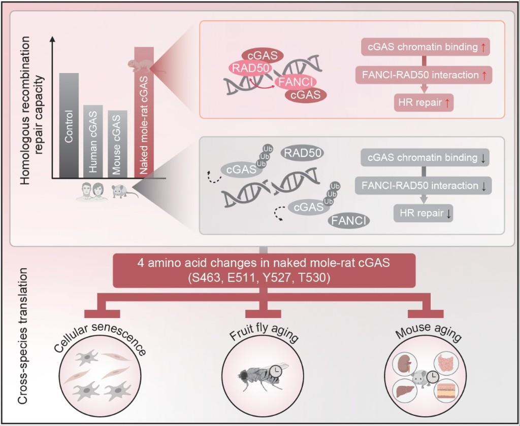 2018年,毛志勇教授团队与同济大学医学院、附属上海市肺科医院戈宝学教授团队合作发现人类cGAS蛋白在DNA损伤后会入核并抑制同源重组修复,导致基因组不稳定。基于此合作研究,研究团队发现裸鼹鼠cGAS的功能发生颠覆性逆转——它可显著提升同源重组修复效率。