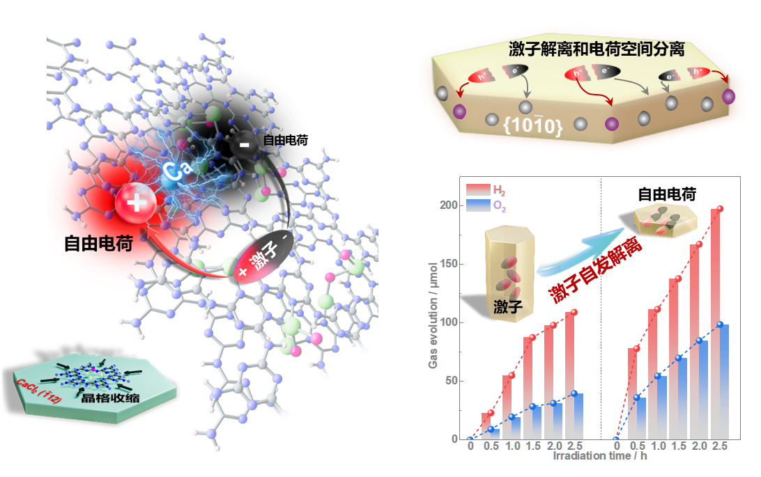 PTI是一种以碳、氮为主要成分的聚合物半导体材料,具有成本低、环境友好、结构适合光催化等优点,在实现低成本、规模化太阳能制氢方面具有广阔前景。然而,它的实际效率一直不高,主要是因为其在光照下产生的正负电荷,也就是电子和空穴,很容易被“绑定”在一起形成“激子”,并最终重新“拥抱”在一起而消失,无法有效参与制氢和制氧反应。